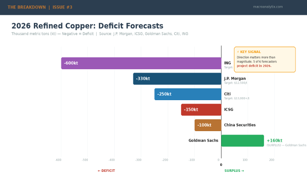 The International Copper Study Group (ICSG) marked a structural turning point in October 2025, after years of modest surpluses, the refined copper market is swinging to a 150,000-ton deficit in 2026. J.P. Morgan is more aggressive, projecting a ~330,000-ton refined copper deficit. ING sees 600,000 tons.
