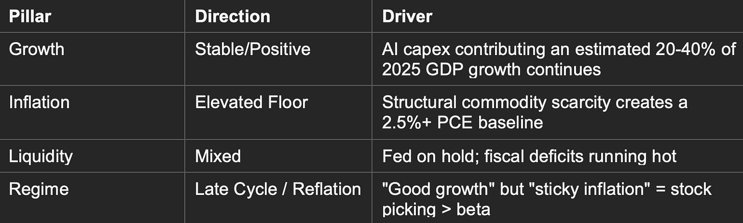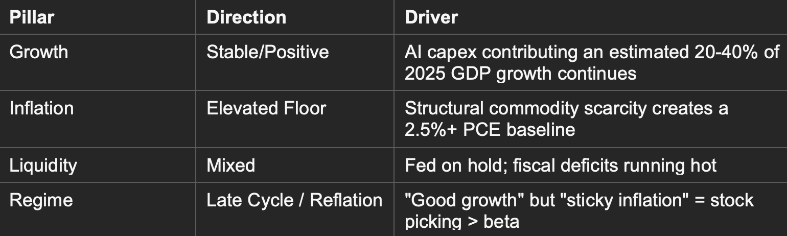 This resource bottleneck is shifting our Growth and Inflation pillars toward a “Reflation” or “Late Cycle” bias: