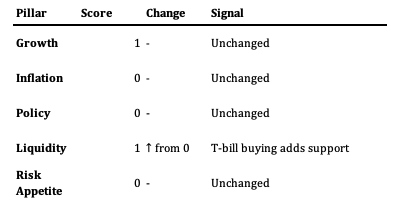 T-bill buying is unambiguously positive. Liquidity stays at +1 (Supportive), trend →. The Fed is adding reserves into year-end, not just maintaining them. For risk assets, this is the silver lining in an otherwise hawkish package.