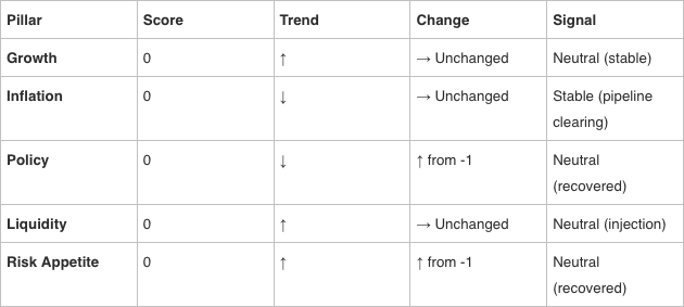 This week, Policy recovered from -1 to 0. Risk Appetite recovered from -1 to 0. The aggregate score is back to flat. The Strong Headwind classification cleared to Neutral. All four validation checks pass.