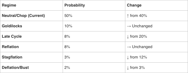 The probability distribution normalized. Stay Current at 50% is up from 40%. Combined bear case (Late Cycle + Stagflation + Deflation) dropped to 13% from 35%. Combined bull case (Goldilocks + Reflation) remains at 18%. The asymmetry that tilted bearish last week has flattened.
