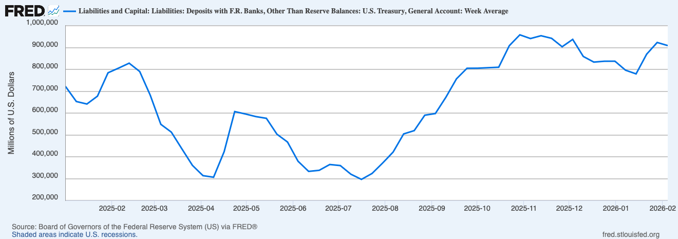 The components tell the story. Fed Balance Sheet at $6,606 billion is up $18.5 billion. Treasury General Account at $908.7 billion is down $14.3 billion, when TGA falls, reserves flow back into the system. RRP at $3.1 billion is up slightly.
