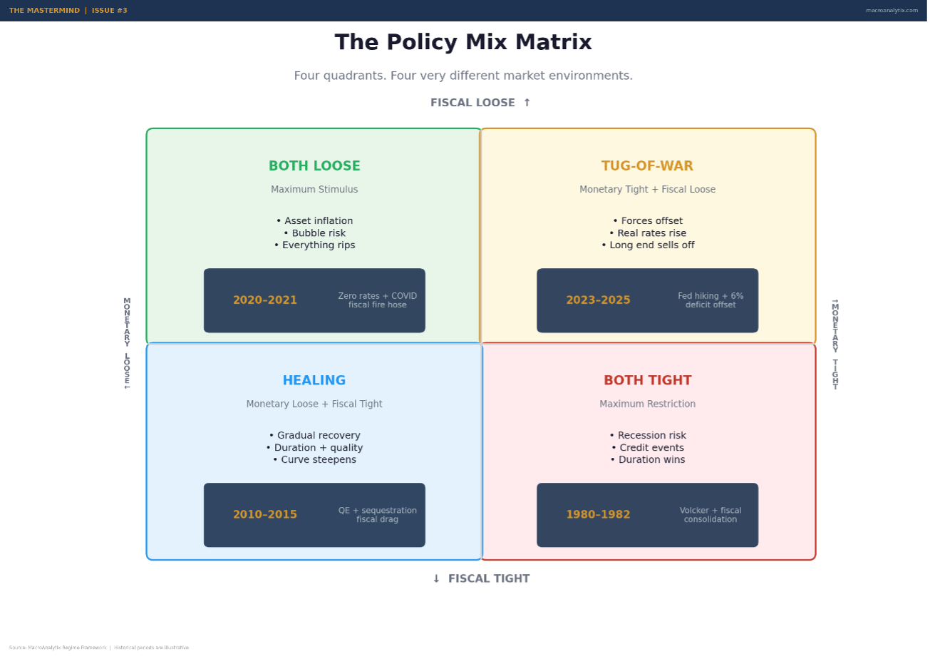 Build the Policy Mix Matrix. Plot monetary versus fiscal on a 2×2. Update it weekly. It takes thirty seconds and is genuinely the most underrated tool in the entire framework.