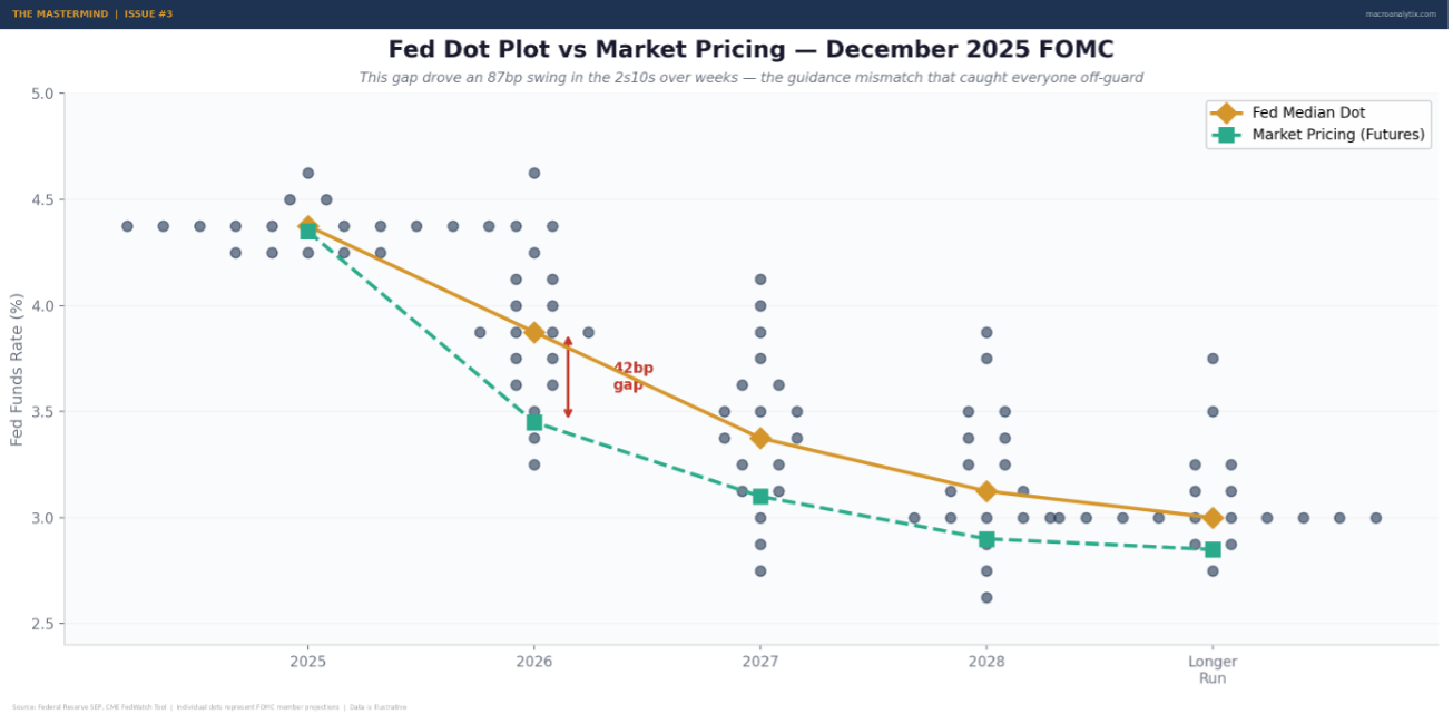 The December 2025 FOMC was a perfect example. The dot plot showed only one cut for 2026. The market had been pricing three to four. That gap, between what the Fed said and what the market believed, drove an 87 basis point swing in the 2s10s spread over a matter of weeks. If you were paying attention to the guidance mismatch, you were prepared. If you were just watching the headline rate, you were blindsided.