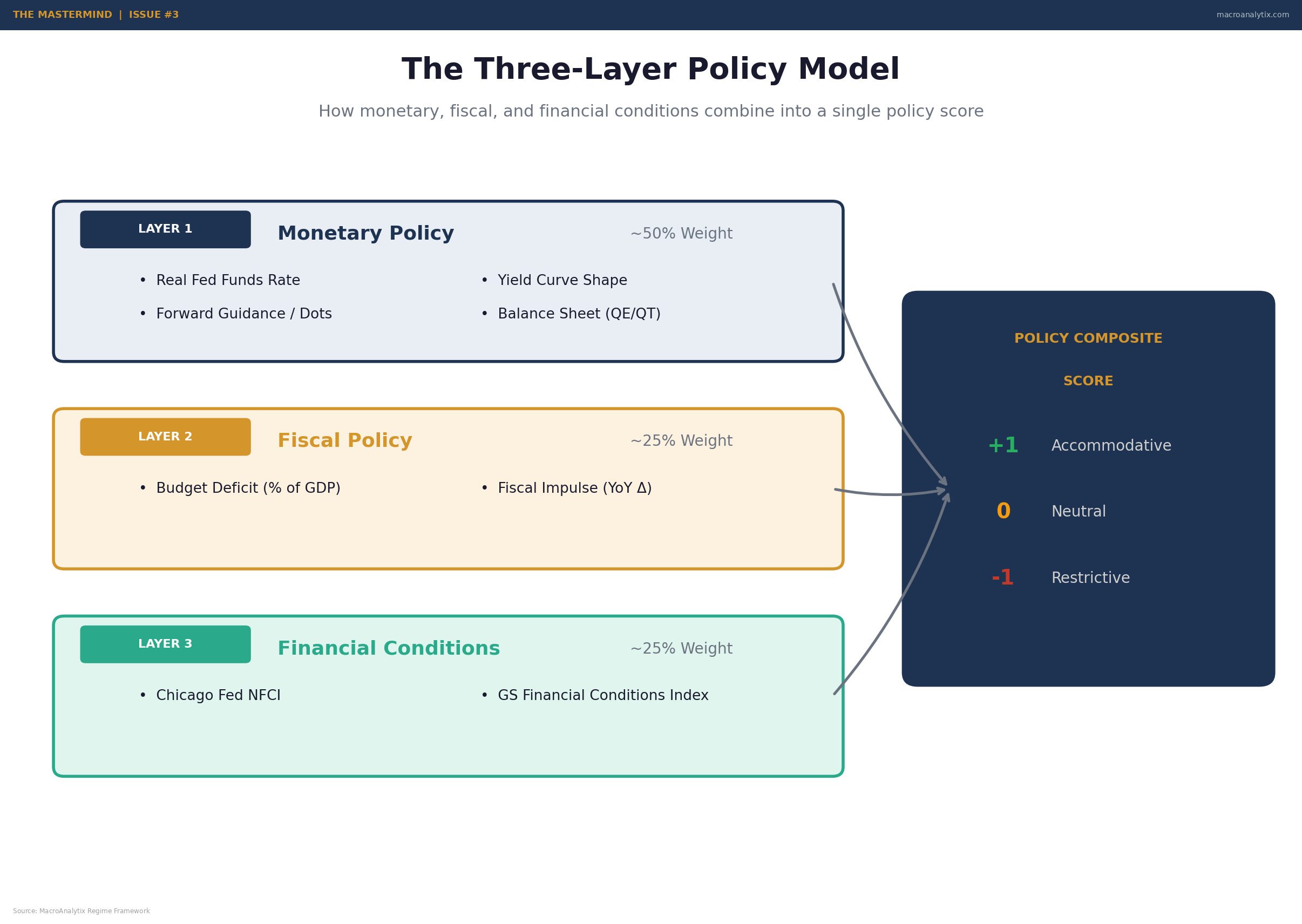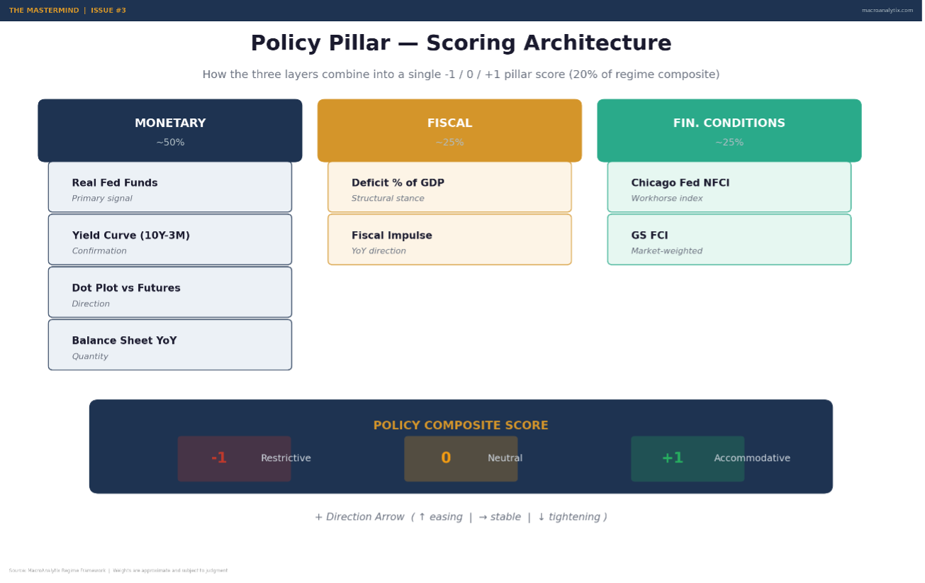 Start with the three layers. Separate monetary, fiscal, and financial conditions. This is the structure that prevents you from overweighting any single policy dimension and ensures you capture the interactions.