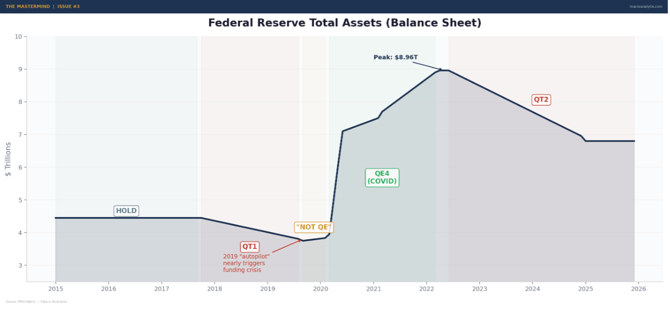 I track the balance sheet as a year-over-year change. Expanding balance sheet = accommodative. Shrinking = restrictive. The pace matters too. A gradual runoff is very different from active selling. The Fed learned this the hard way in 2018-19 when “autopilot” QT nearly triggered a funding crisis.