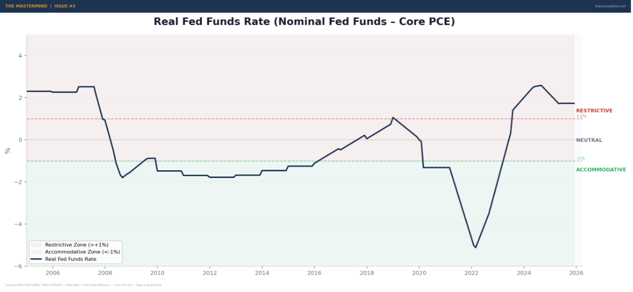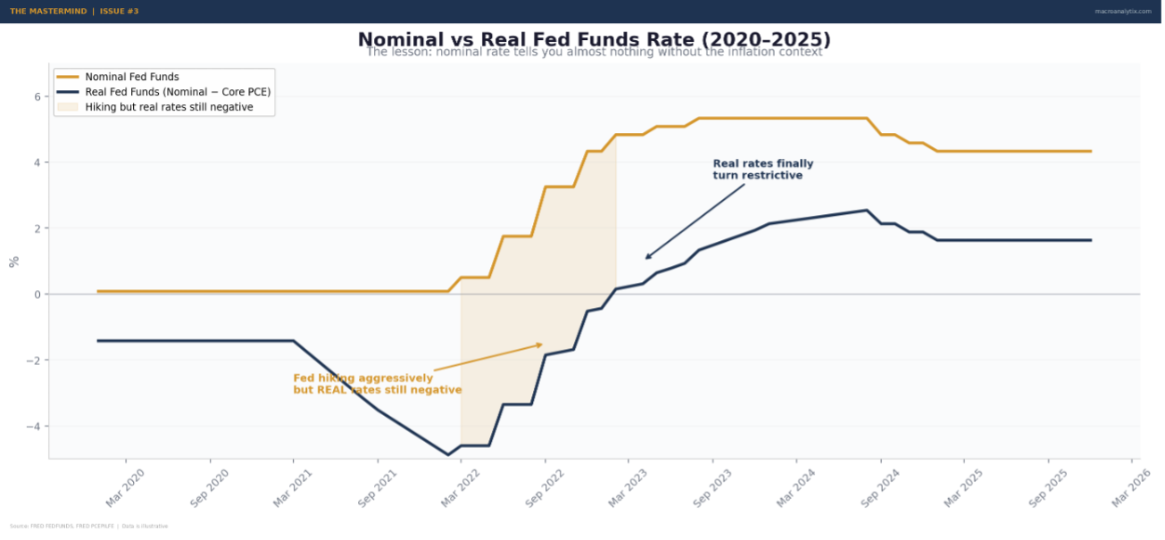 The nominal Fed Funds rate (the number you see on the news) tells you almost nothing by itself. A rate of 4% is restrictive when inflation is 2% (real rate = +2%). The same 4% is accommodative when inflation is 5% (real rate = -1%). The economy doesn’t care what the nominal rate is. It cares what the rate is relative to inflation.