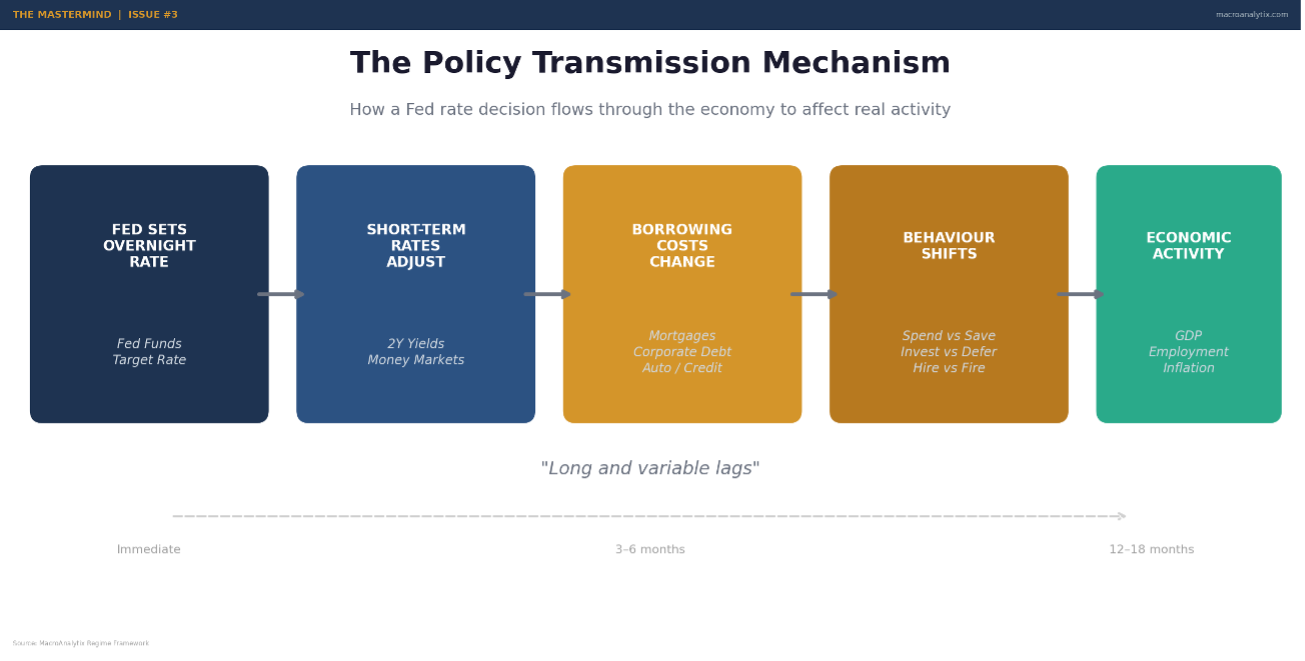 Think about it mechanically. When the Fed sets the overnight rate, it anchors the entire short end of the yield curve. That rate ripples into mortgages, corporate borrowing costs, auto loans, credit cards, every form of debt in the economy. When those costs change, so does behaviour. Businesses invest more or less. Consumers spend or save. Housing booms or busts. The transmission mechanism from a 25 basis point change in Fed Funds to actual economic activity is slow, messy, and uncertain but very real.