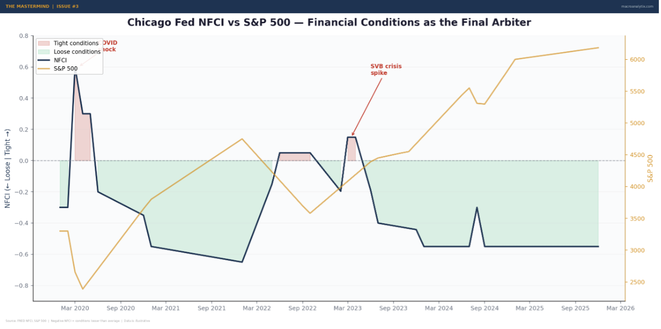 Layer 3: Financial Conditions. The aggregate result of both monetary and fiscal policy, filtered through markets. Are conditions loose or tight? Is credit flowing or constrained? Are asset prices inflated or depressed? Financial conditions indices capture the net effect of everything the authorities are doing and everything the market is doing in response.