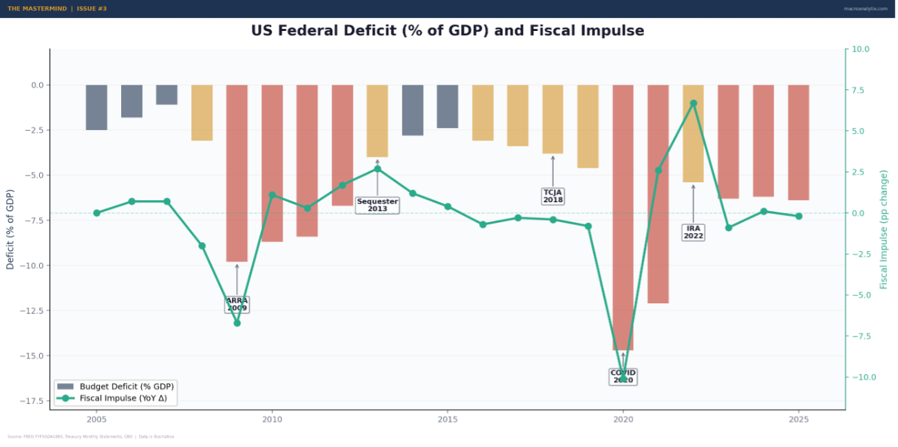I track both. The deficit level tells me the structural stance. The fiscal impulse tells me the direction. When both are positive and rising, fiscal policy is a strong tailwind. When the deficit is large but narrowing, fiscal is shifting from tailwind to headwind regardless of the absolute number.