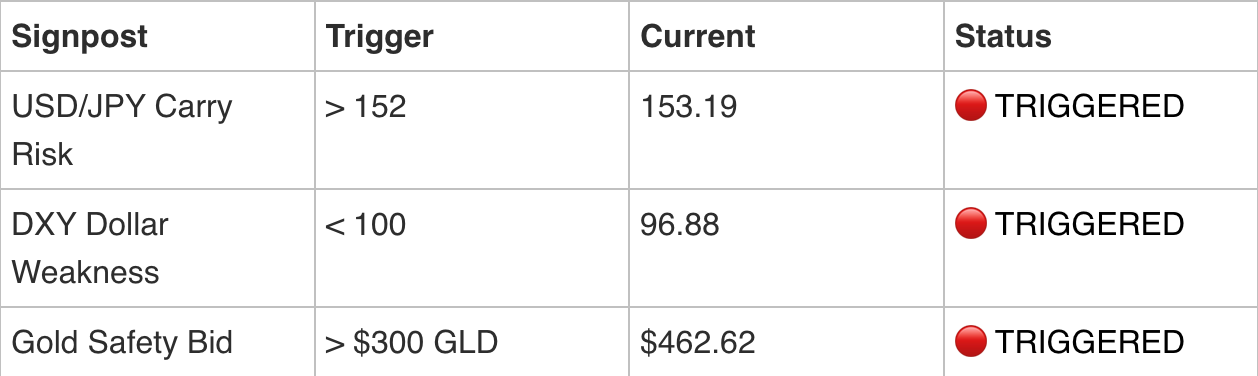 USD/JPY improved to 153.19 from 157.09, a 4-yen pullback that reduces BoJ intervention risk. Still triggered. These signposts have been active for ten weeks, background noise until they’re not.