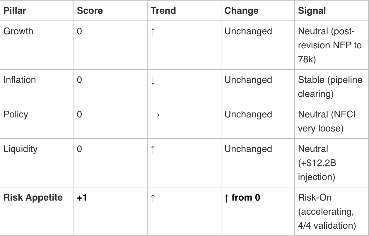 Risk Appetite surged from 0 to +1, a 1.5-point improvement that tips the aggregate score positive and flips the modifier from Neutral to Tailwind. The catalyst? Post-revision NFP 3-month average recovered and doubled to 78k. The hiring freeze narrative from Issues #008-009 looks increasingly like a statistical artifact.