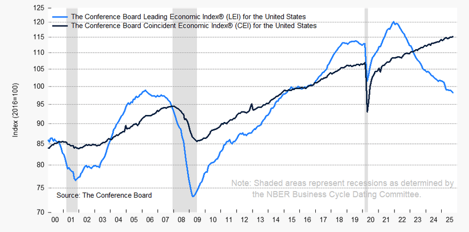 The Conference Board Leading Economic Index is down 2.1% over six months—flashing the classic recession warning.