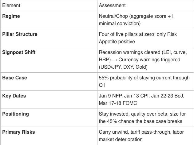The Pattern: The cleared signposts were about recession risk. The triggered signposts are about currency and carry risk. We’ve moved from “is the economy about to crack?” to “are currency relationships about to reset?” Different risk, different implications.