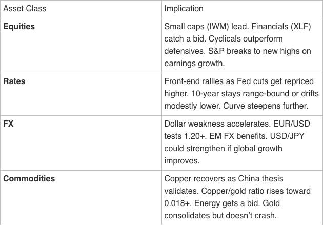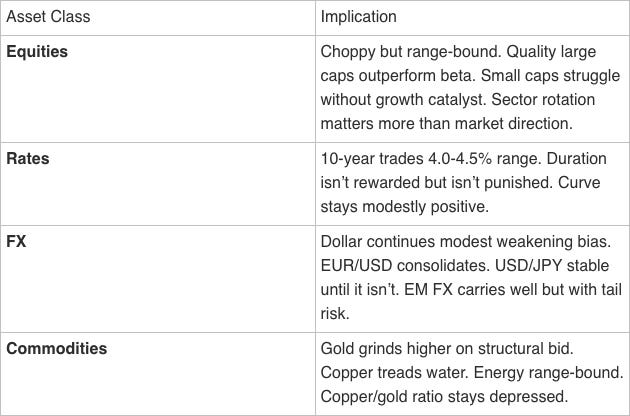 The most likely outcome is that nothing decisive happens. Growth stabilizes around current levels. Inflation continues its slow grind toward target. The Fed stays on hold. Liquidity conditions remain adequate. Markets chop sideways with occasional volatility spikes.