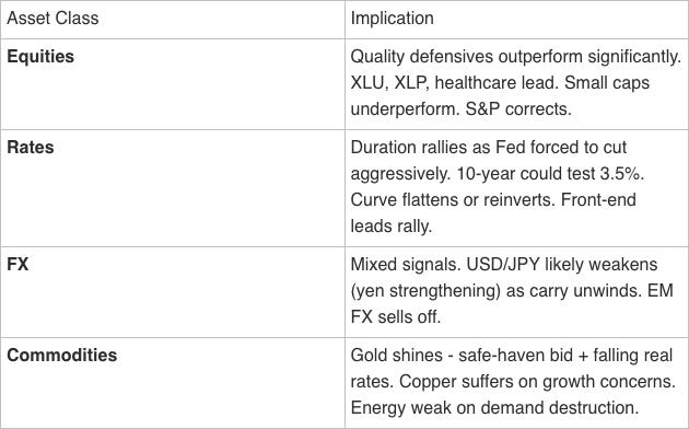 Path to Deflation/Bust (2%): Requires a credit event or systemic shock. HY spreads breaking above 400 bps. A funding market dislocation that the Fed doesn’t contain quickly enough. The carry unwind cascading beyond FX into broader risk assets.
