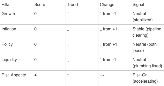 The dashboard reads directionless - aggregate score of +1, minimal conviction. Four of five pillars score at zero. Only Risk Appetite is positive, and it’s carrying the entire regime read. That’s a fragile structure.