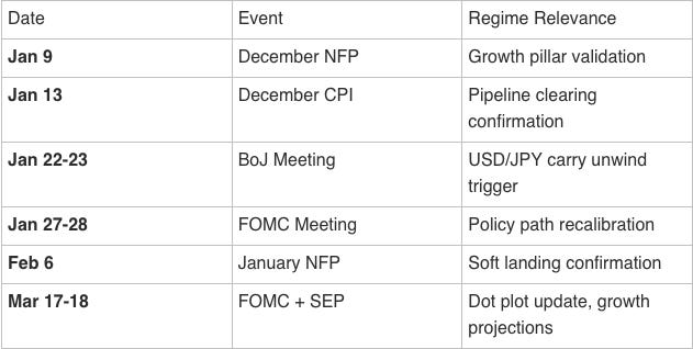 Regimes don’t shift in a vacuum. They shift when data confirms or contradicts the current consensus. Here are the dates that matter for Q1 and what each event could mean for the regime.