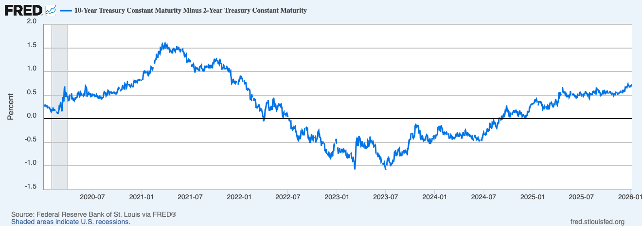 2s10s Uninversion: The yield curve had steepened to +68 basis points from its inverted lows, triggering the historical “recession confirmation” signal. The aggressive steepening has moderated. The curve isn’t screaming anything right now.