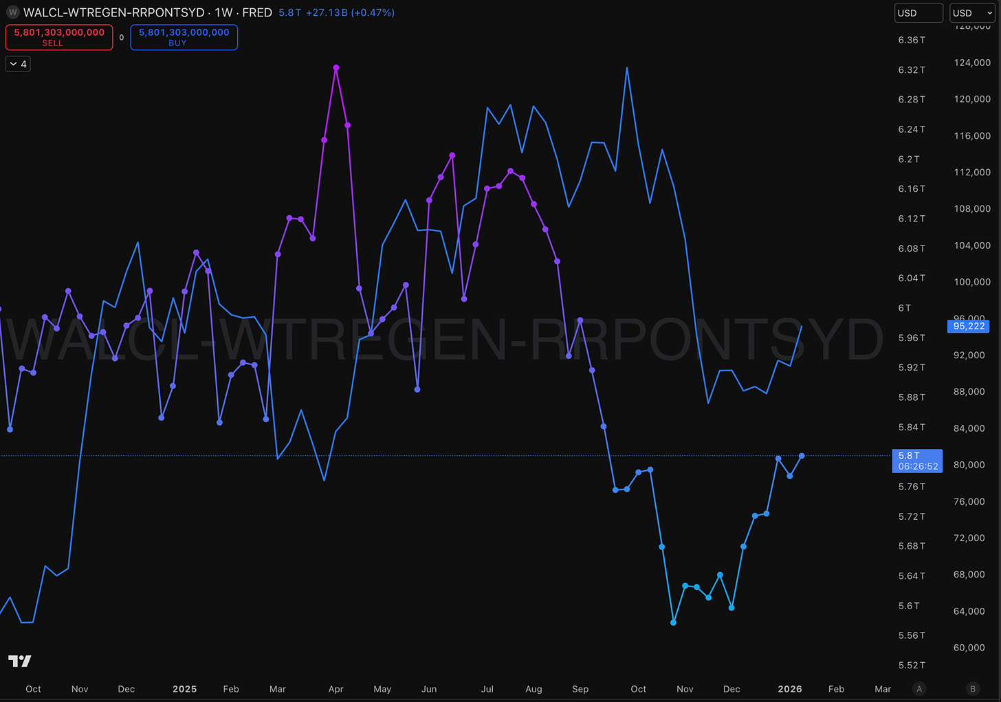 But net liquidity actually rose. Current reading: $5,801.78 billion, up $27 billion from last week. Fed balance sheet ticked to $6,582 billion. TGA fell to $779 billion, releasing reserves into the system.