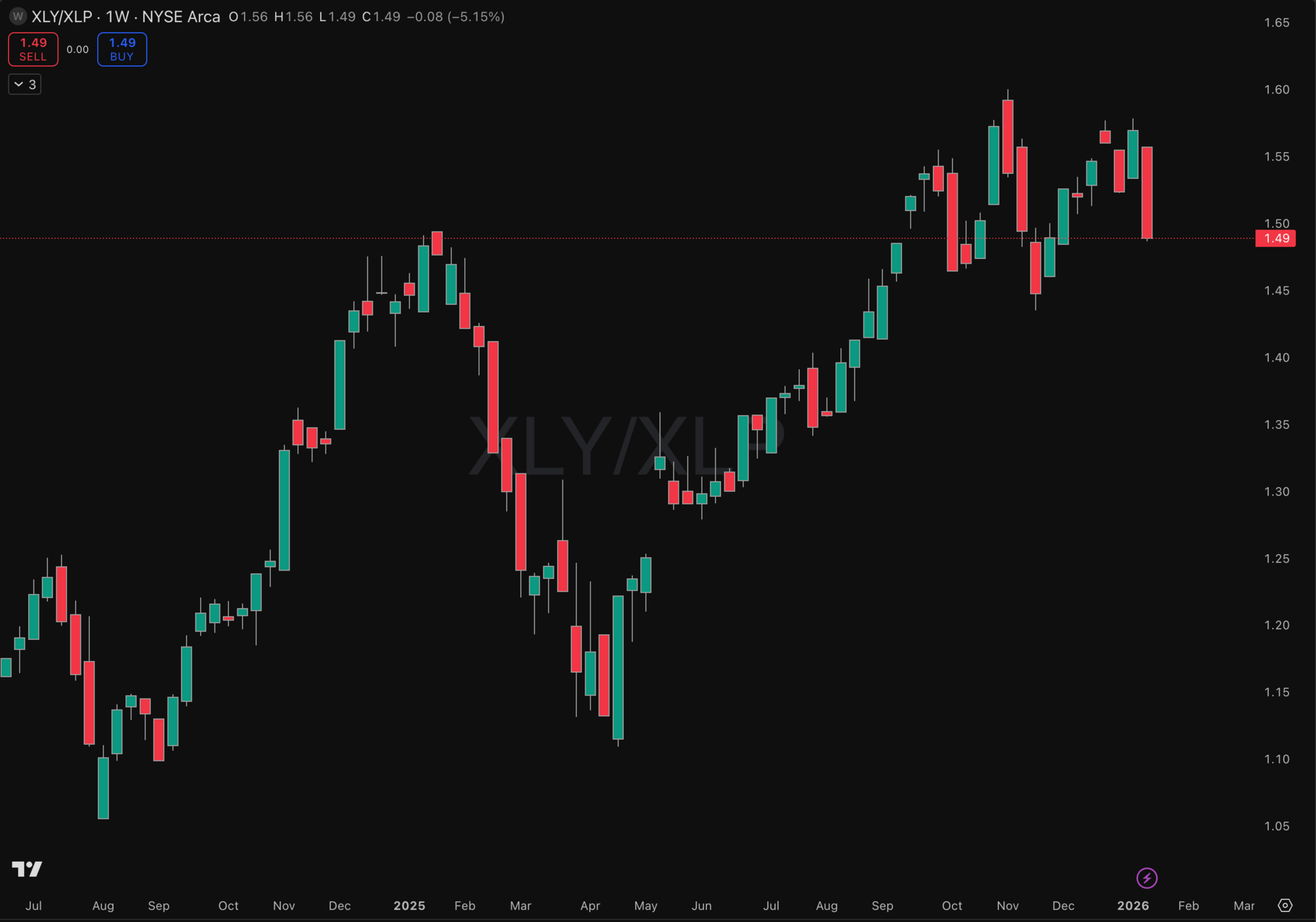 Source: TradingView: Consumer Discretionary vs. Consumer Staples Ratio (XLY/XLP)